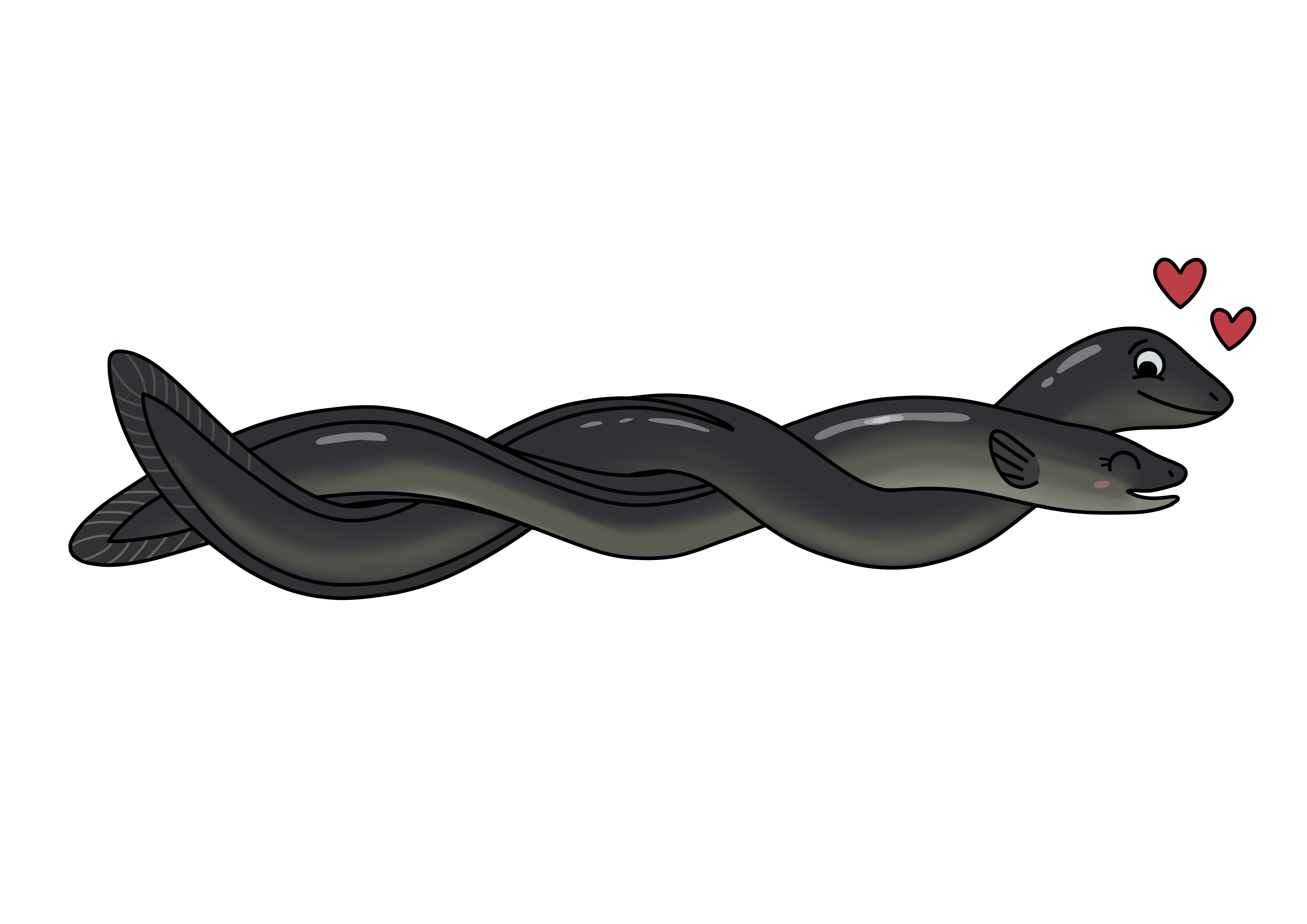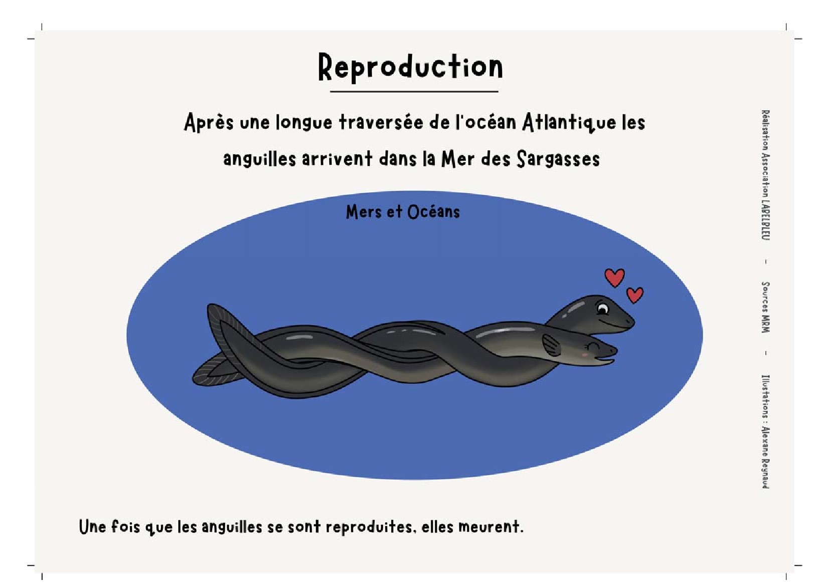 Cette fois, on m’a proposé de dessiner le cycle de vie de l’anguille ainsi que deux anguilles amoureuses.